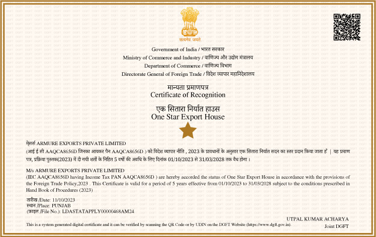 Armure Exports is a BSCI (Business Social Compliance Initiative) compliant Company, and applies all aspects of ethical business practices in its day-to-day functions. Total dedication to quality has made it possible for the company to achieve such a proud position in the global market.